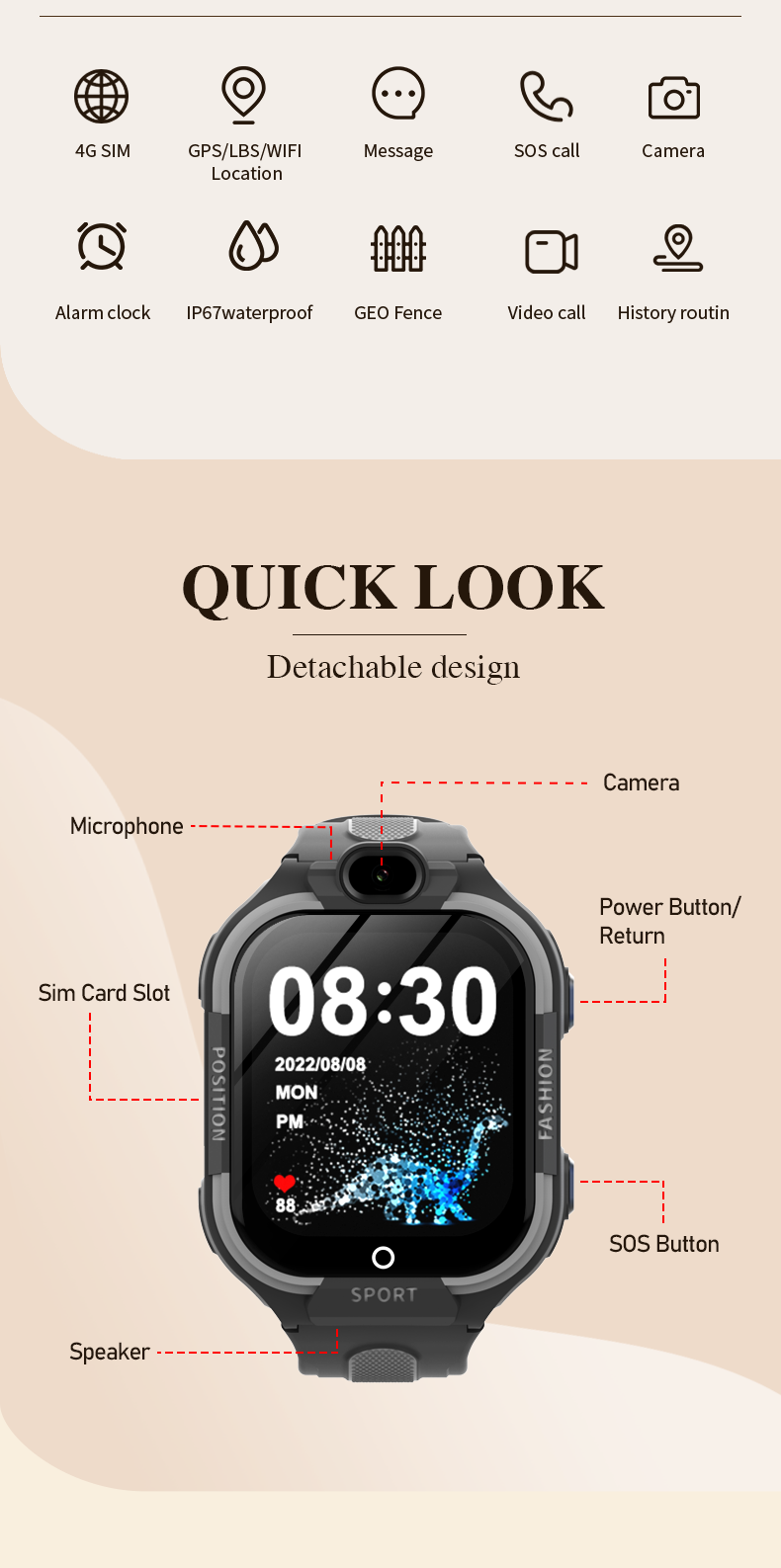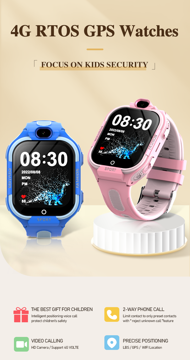 4G android smart watch, Kids GPS SOS watch, 1.85'' IPS display, HD camera, GPS/WiFi/LBS accurate positioning, Geofence, sos button..